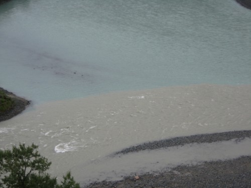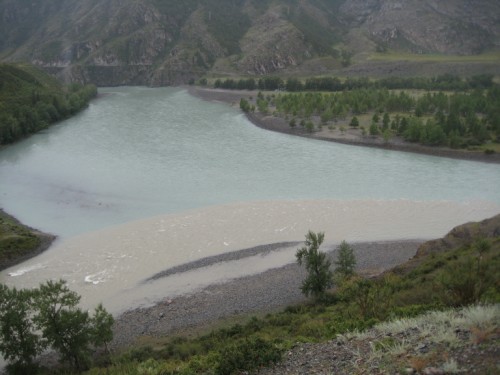 Заехали на слияние рек Катунь и Чуя, еще раз удивились, на сколько может быть разная по цвету вода в горных реках: