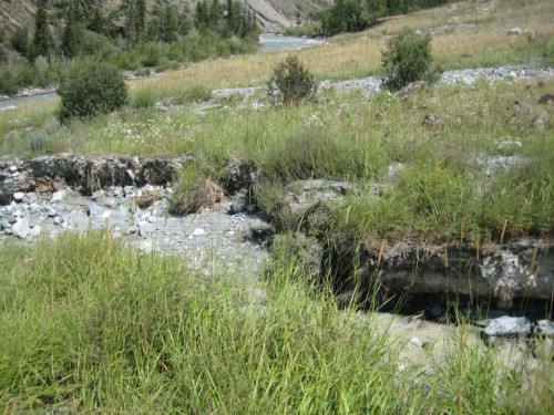 Я спустился и перебравшись на другой берег решил еще разведать до куда можно проехать вдоль р.Карагем в сторону Карагемского перевала. Оказалось, что совсем недалеко. Примерно через километр каменистого пути, дорогу перекрыли разломы в земле, можно было попробывать их преодолеть, но я видел, что вдалике они идут один за другим увеличиваясь в размерах.