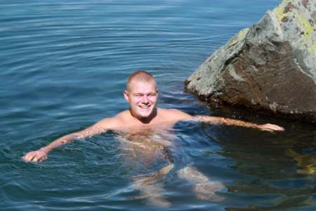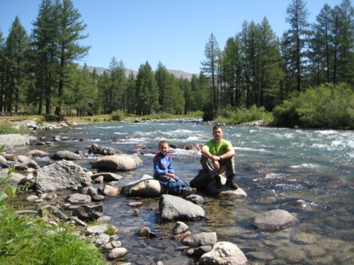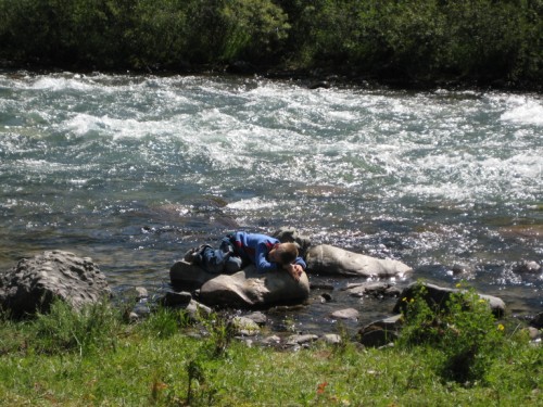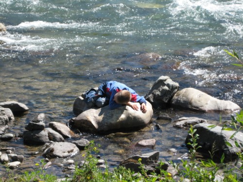 Вечер был теплый, ни облачка ни ветерка, а вот ночью был страшный холод от реки. Как только утром солнышком прогрело камни, сын побежал досыпать и греться на них пока мы с женой сворачивали лагерь ))))