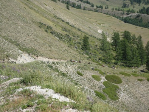 А пока стоим на перевале, дожидаясь когда пройдет конная тургруппа, направляющаяся 11-дневным маршрутом на Белуху. Чтобы не испугать коней работающим двигателем.