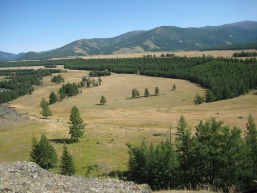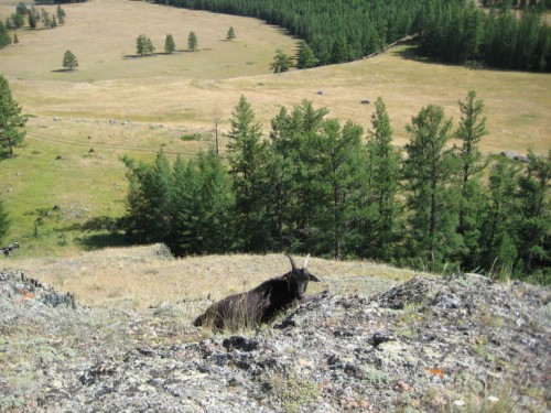 Степь пересечена несколькими лесополосами и расположена на ступенях, поэтому полного обзора её нет. Проехав до р.Коксу забираемся на горку и распинывая горных козлов проводим обзор окресностей, чтобы определить свое местонахождение. С пригорка озеро обнаружили, но также обнаружили еще ферму невдалике от него, и чтобы не разочароваться в нем, боясь увидеть вместо озера водопой для скота мы решаем к нему не ехать - пусть оно останется в нашей памяти красивым далеким и завораживающе-сияющим синим пятнышком на фоне золотой поверхности степи Самаха, а не истоптанной копытами лужи.