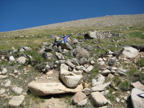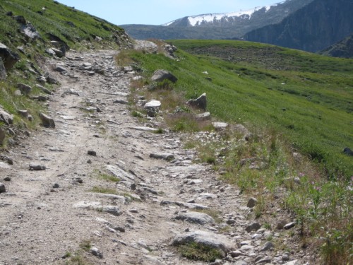 После первого поворота дорожка разветвилась и я неподумавши решил проехать по менее каменистому участку. В результате я оказался в болотине и чудом не засев там в развороченной Шишигой колее со сдернутой дерном выскочил на камни. Больше я таких оплошностей решил не делать - лучше сминая пороги по камешкам пропрыгать, чем сидеть и куковать в верховых болотах, ожидая пока кто-то проедет мимо. Людмила сказала. что прогуляется пешком, а мы с Сережкой рванули на вершину перевала по дорожным валунам.