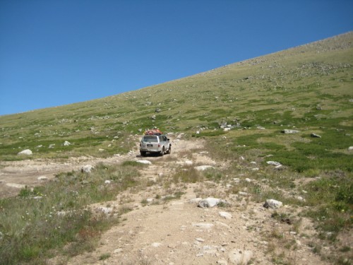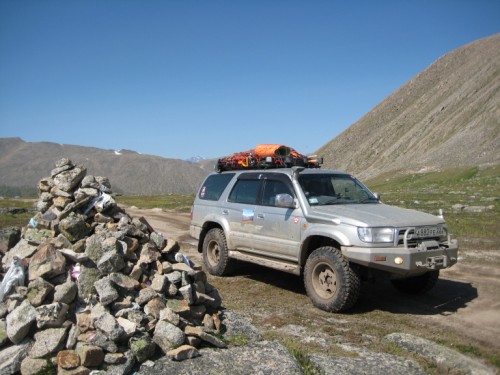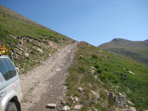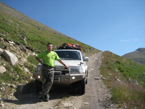 Прогулявшись и выпив за благополучный подъем по стакану апельсинового сока, мы спускаемся к машине. На перевале в болотинке сидел московский Прадик, которого тянула такаяже московская Мазда (не знаю точную марку джипа). Спросив нужнали помощь и получив отрицательный ответ, спускаемся вниз. По дороге встретили жену, предложили подвезти, но она сказала, что теперь прогуляется пешком вниз ))))