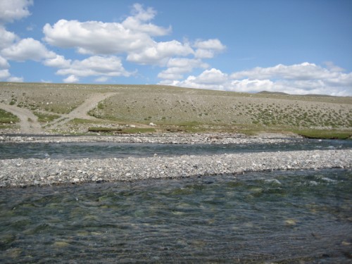 Надо было промерять брод ногами и я полез на багажник доставать болотники. Пока вынимал их из мешка на той стороне Бугузуна появился конник с 2-мя сопровождающими его собаками. Глядя, как конь форсирует брод, я понял, что в одну машину соваться туда всеже не стоит - вода доходила коню по брюхо, а бедных плывущих собак снесло по течению метров на 30 от него, пока они переплывали этот участок. Взвесив все за и против, мы пришли к выводу, что в такие броды можно нырять, только если есть для подстраховки еще попутчик в пути.