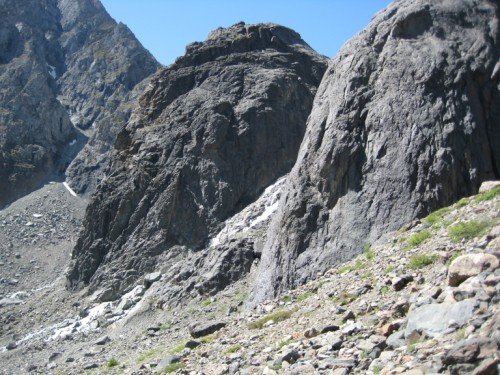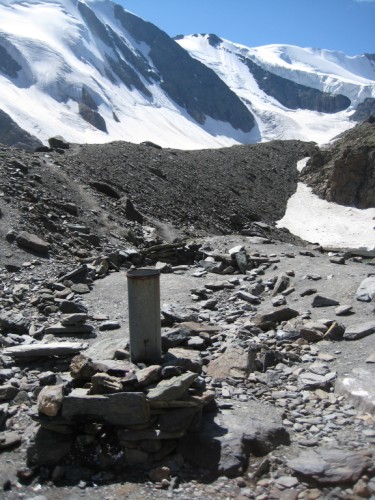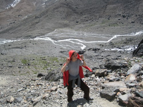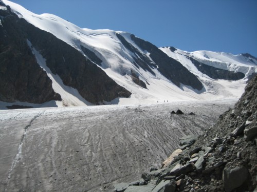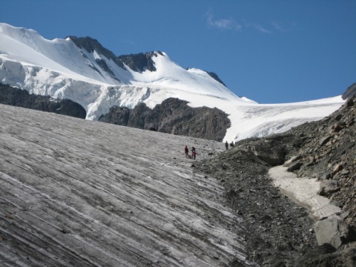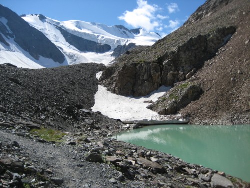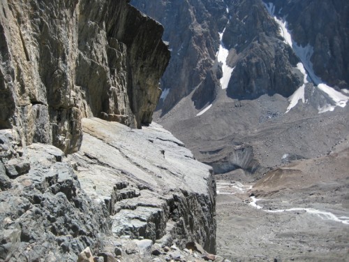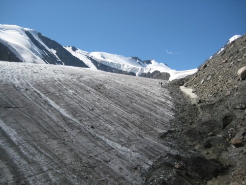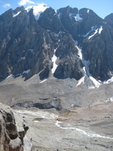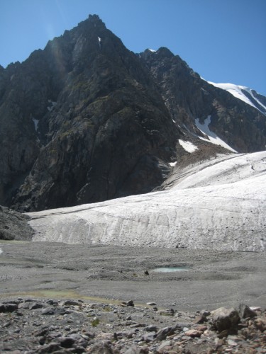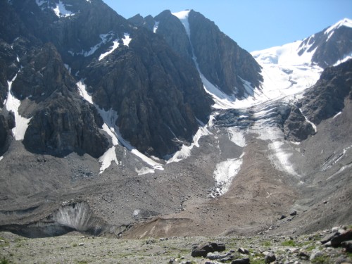 В августе лед внизу уже сильно подтаявший и надутая ветром скальная пыль, дает довольно некрасивый грязный оттенок: