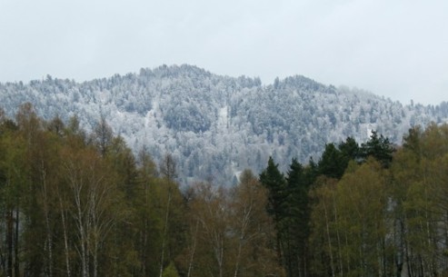 Утром погода слегка испортилась, пошел мелкий дождик, верхушки гор покрылись снегом.