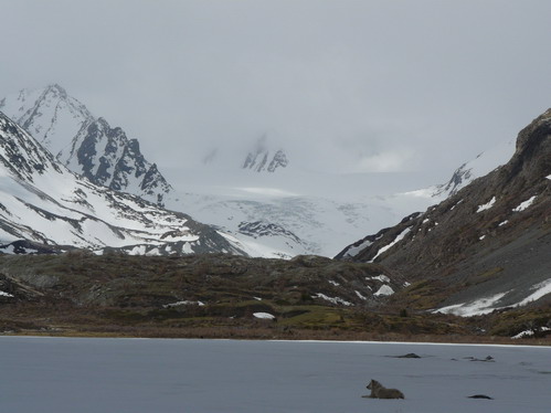 Наш спутник с соседней стоянки носится как угорелый по снегу и по склонам вынюхивая и вылаивая