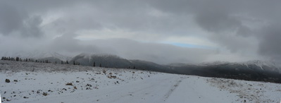 Вершина перевала. Нам удалось разглядеть дорогу, которая то вынырвала, то опять пряталась в снег. На вершине виднелась черная точка, или большой камень или груда камней.